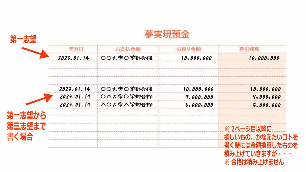■ 受験などの目標の場合は合格を自分なりの価値に金額換算して書き入れます。